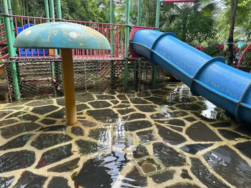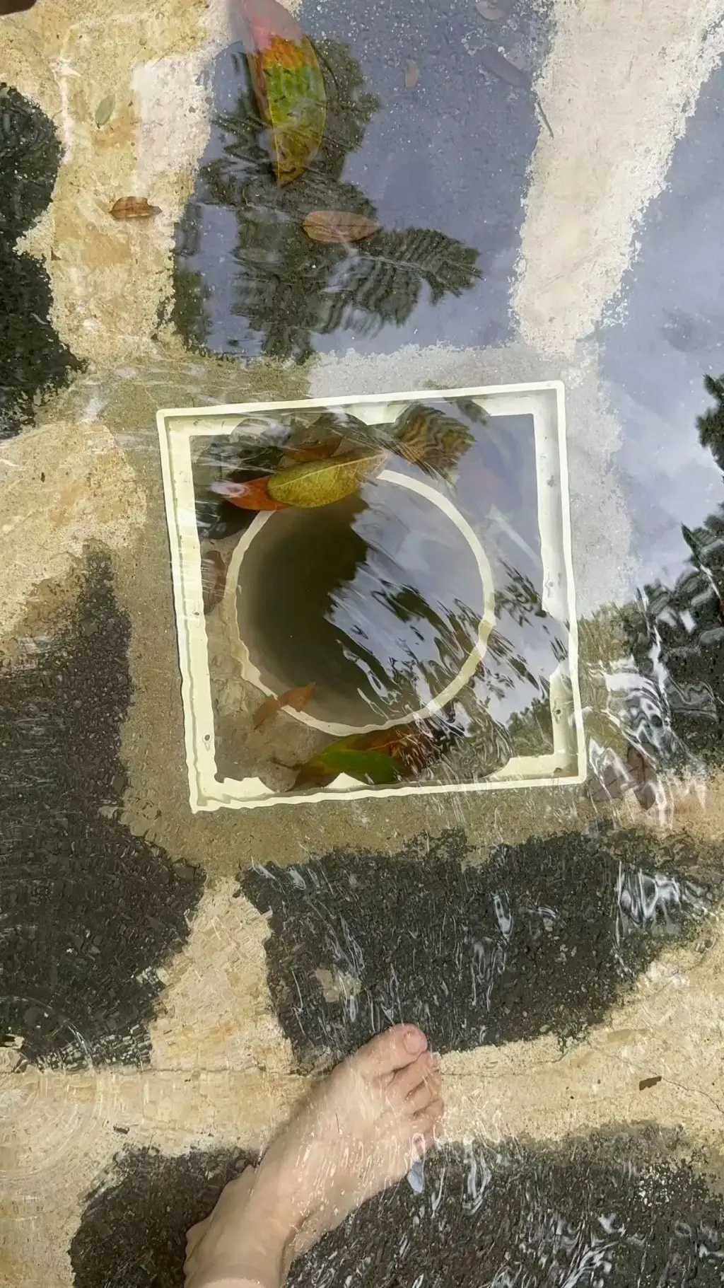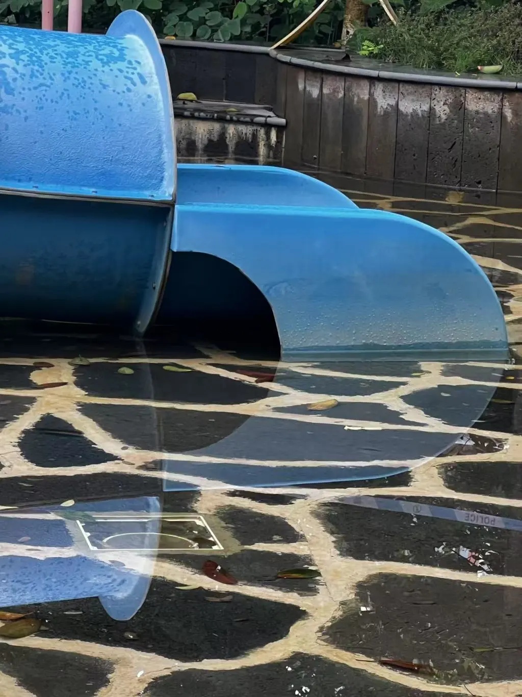 导致事端产生的要害区域——儿童滑梯北侧水池地上的排水管道外见一个固定在水池底的塑料防护格栅网的正方形塑料框,框体内侧边际存在新鲜残缺,且排水管四周的水池内散落着多块断面新鲜的塑料格栅网碎块。
